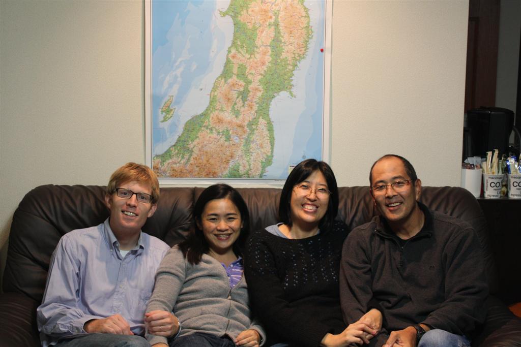 それから、私たちにとって大きな、良い知らせは、沖縄のカルバリー宜野湾で奉仕されていた宣教師夫妻である、チャックさんと由美さんが東松島に移り住み、教会開拓の幻を抱えて宣教活動を行うことです!(チャックさんと由美さんのブログ記事)すでに1日に東松島入りしてアパートを探しています。ぜひ住むところが見つかるようお祈りください。4-6日には、私たちと一緒に月浜の仮設住宅にて宿泊する予定です。(下の左側の男女です。右側はすでに沖縄から仙台に引っ越して奉仕をされている、ロイさん&ナンシーさん宣教師ご夫妻です。)