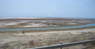 私たちは、この陸続きになっている部分の横を走りました。横に細長い運河が見えます。エメラルドグリーンに輝く水です。これは北側の死海の部分の水を、南側の死海の部分に流し入れるためです。これを行なわないと南側の部分が干上がってしまいます。
