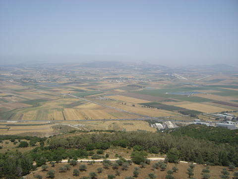 上の写真は左がイズレエル平原の正面を撮っているものです。ナザレの山が左にあり、続けて右にタボル山、モレ山があります。手前、右上にV字形の滑走路が見えますが、これは発着の滑走路が地下につながっている「ラマト・ダビデ空軍基地」です。そして右の写真は左にギルボア山、サマリヤの山地があり、手前左側にヨクネアムの丘状遺跡があります。ヨシュアが倒した王の一人がここにいました(ヨシュア12:22)。