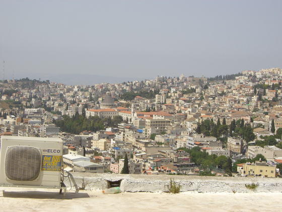 そしてさらに754号線を南下し、主が育たれた「ナザレ」の町に到着しました。ここはイスラエル国の中で最大のアラブ人の町で、六万人が住んでいます。以前はほとんどがキリスト教徒でしたが、イスラム教徒が入り込み半々になっているそうです。99年と08年の旅では、北東にあるユダヤ人の住む同じく「ナザレ」という町からこの旧ナザレを眺めましたが、アーノルドはもっと近づいてその中心部分を見せてくれました。混雑する車道の脇に駐車して、どこかのお店の二回に上がる外階段を上っていき、グループを二つに分けて、同じ説明をアーノルドは二回しました。
