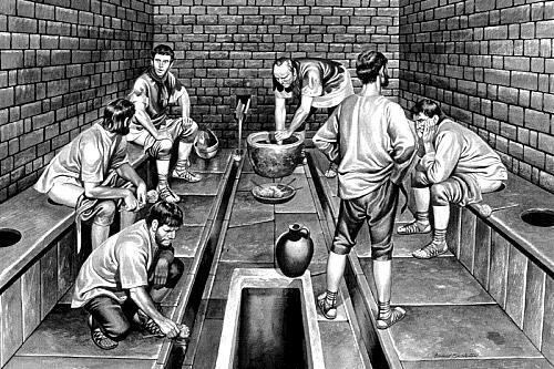 そしてトイレの説明です。このトイレは、ギョムナシオンの隣接のローマ風呂に行く人たちと、商店街を利用する人たちに使われていたでしょう。古代ローマのトイレは、仕切りはないのですが、その下に側溝があって、それは流れていたので、まさに水洗でした(ローマ風呂の水が使われたことでしょう)。海綿のスポンジを棒に付けて、その海綿でお尻拭きをするとのこと。もっと大きなトイレを、エペソで見ることになります。そして、これが私たちの主が十字架で受けられた恥辱にもつながってくるのです(参考記事)。こちらやこちらにも、当時どうなっていたかを示す絵があります。そして、お金持ちは冬の寒い時、まず奴隷に座らせて、用を足すところを温めてもらったそうです。