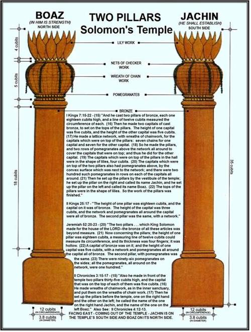 興味深いことに、ソロモンの神殿には神殿の入口のところに、二本の青銅の柱が立っています。一方はヤキンという名で、「彼は設立する」という意味です。もう一方はボアズという名で、「力をもって」という意味です。神殿に入る時にいつも、神が力をもって堅く立たせてくださることを思い出すのでしょう。ところで装飾については、絵をご覧ください。